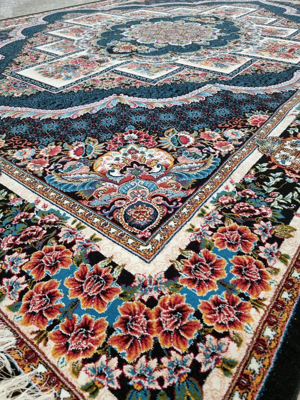 فرش 6متری 700شانه جدید کاشان نقشه زیبای ناردون سرمه ایی مناسب جهیزیه