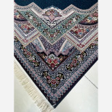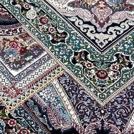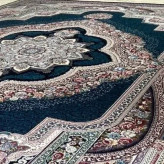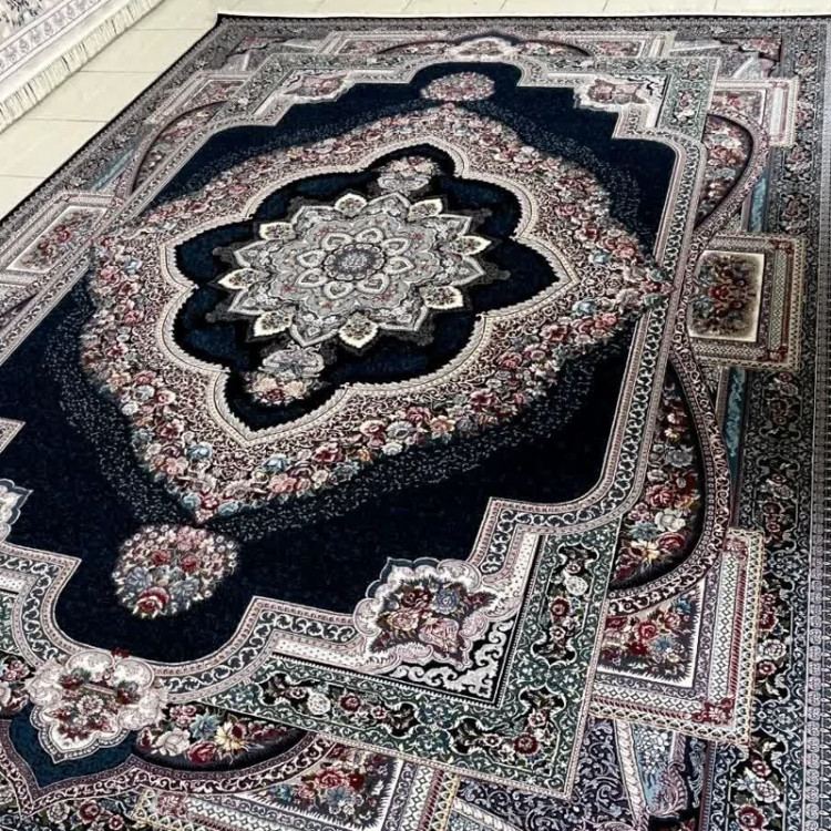 فرش ماشینی6متری 700شانه پرزبلندسنگین وزن نقشه زیبای باغ معلق سرمه ایی مناسب جهیزیه
