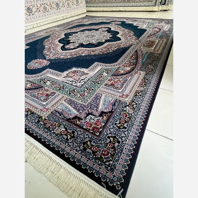 فرش ماشینی6متری 700شانه پرزبلندسنگین وزن نقشه زیبای باغ معلق سرمه ایی مناسب جهیزیه
