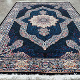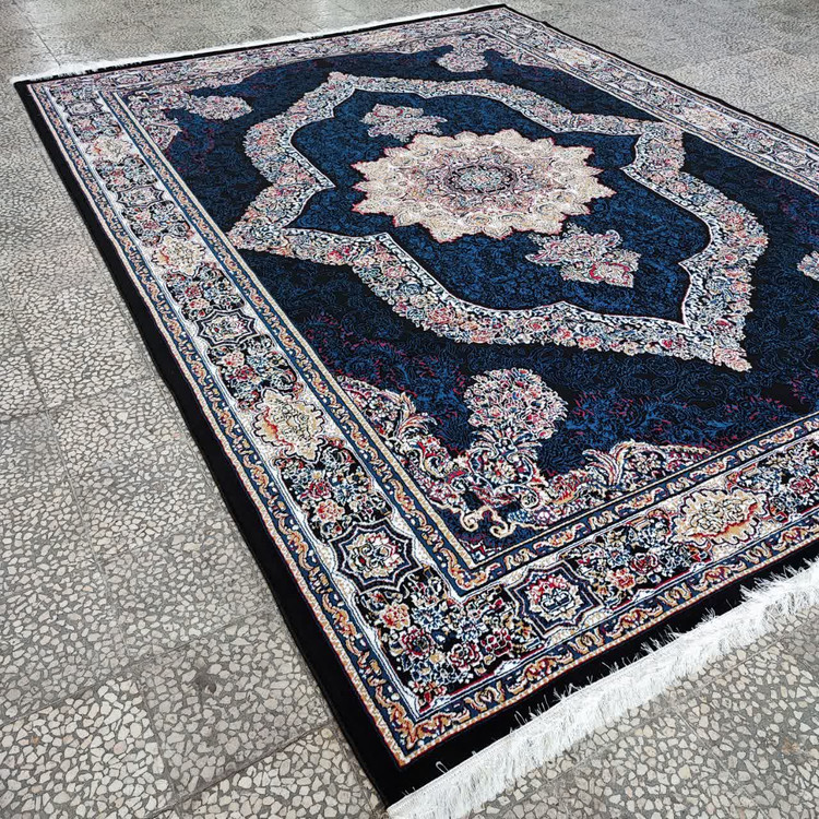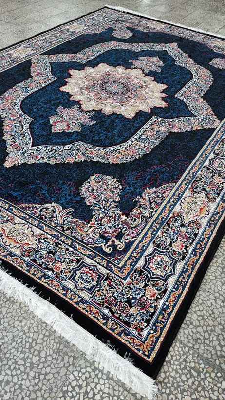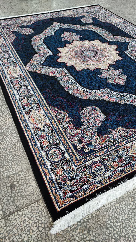 فرش ماشینی 6متری ارزان قیمت کاشان نقشه زیبای کارینا سرمه ایی