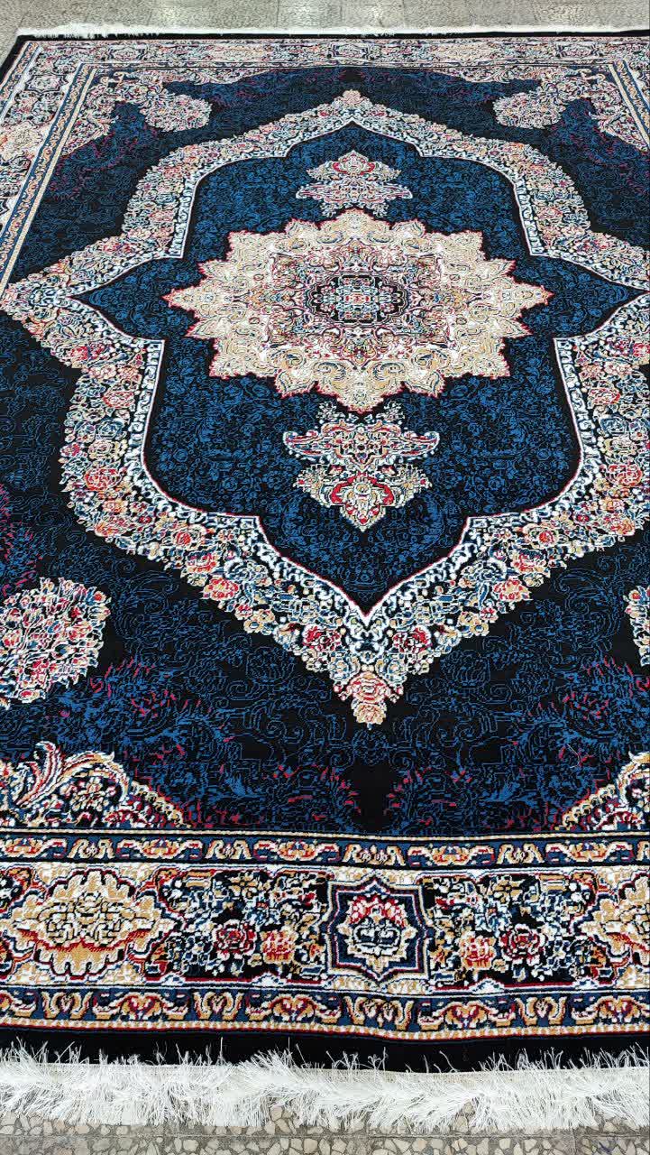 فرش ماشینی 6متری ارزان قیمت کاشان نقشه زیبای کارینا سرمه ایی